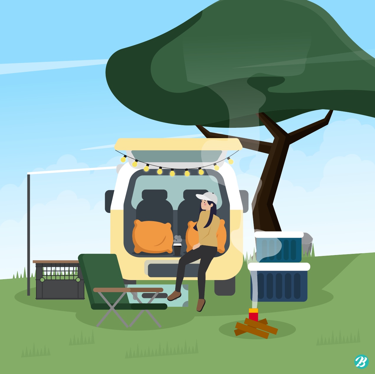 This is Tommy, Master Creator of Urban Brush. The image below is a sample camping illustration under a tree. It is an illustration image that expresses a woman enjoying camping while sitting in a camper under a tree on a hill. It is an illustration image depicting the landscape of car park camping. It is an illustrative image suitable for use in categories related to camping, car park, camper, travel, rest, travel, and vacation. Download the campfire camping illustration vector file under the tree and use it for design related to camping. Included fonts are examples and are not included in the file. Please inquire with the font company for use.