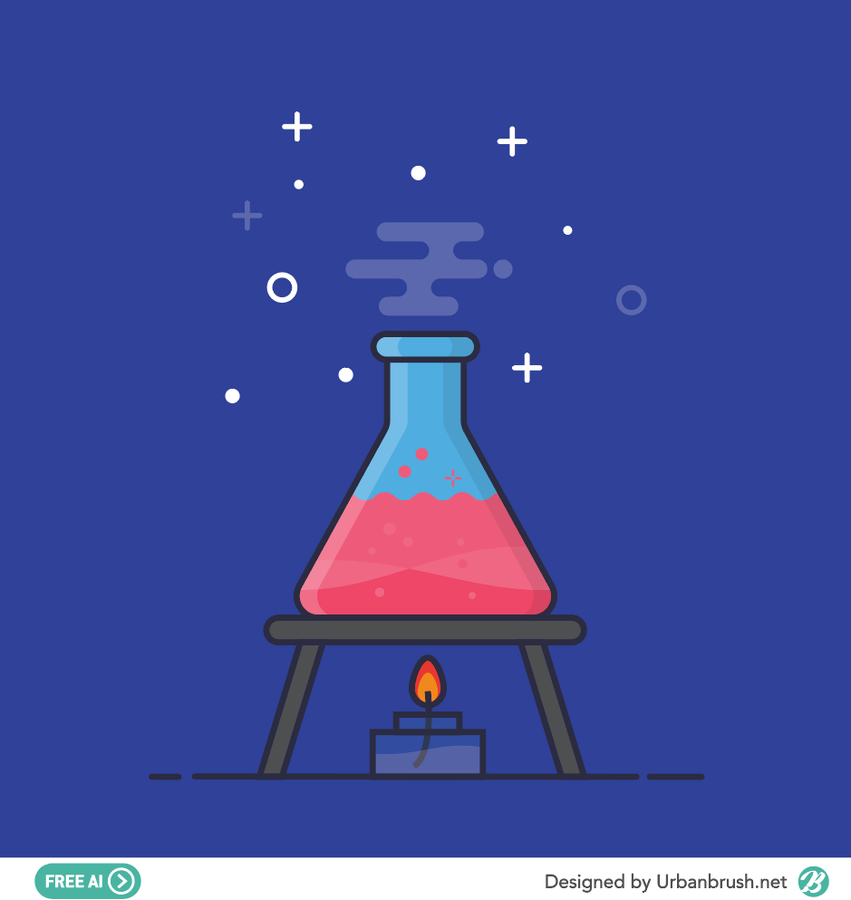 Hi. Urban Brush’s Master Creator Tommy. The image below is a sample of the chemical experiment illustration ai file. This is an illustration image depicting a scene where a flask glass bottle is heated to boil a chemical liquid. The flask beaker is placed on the pedestal and there is a flame beneath it. We have described bubbles and smoke to express the state of being heated. Download chemical experiment illustration vector file and apply it to science related design.