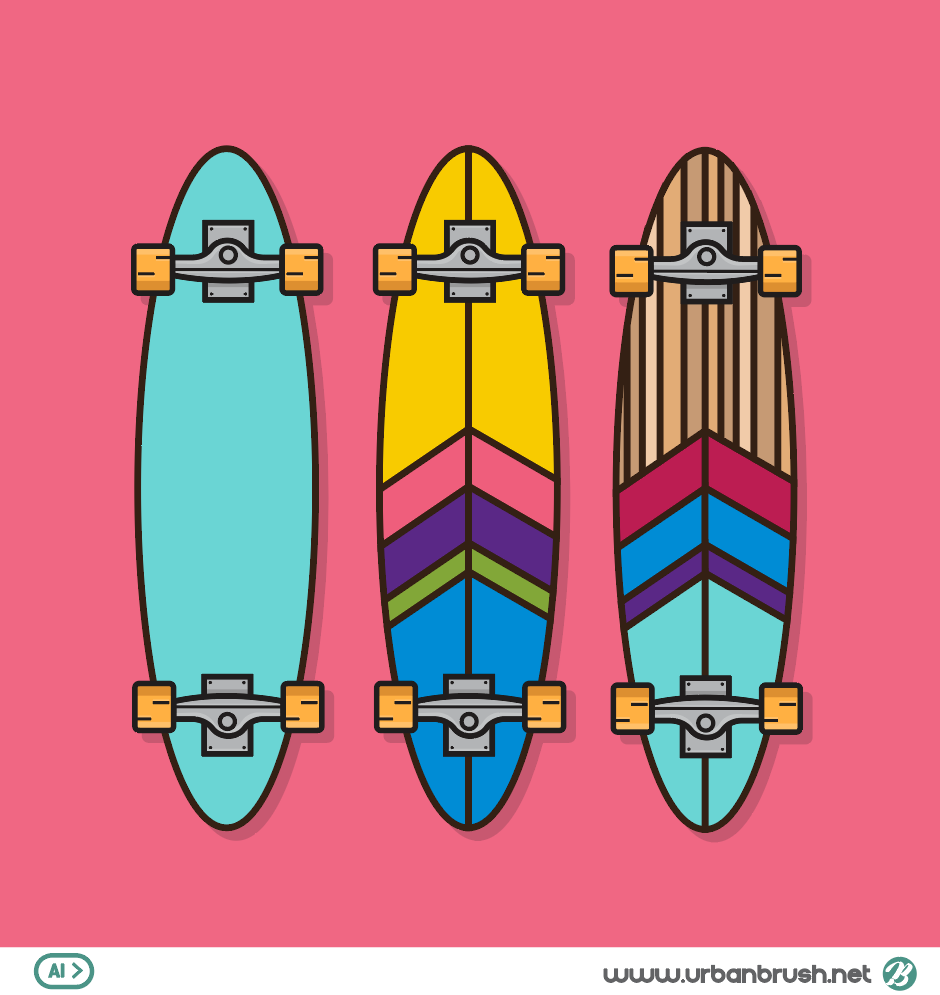 Hi. Urban Brush’s Master Creator Tommy. The image below is a sample of ai file illustrations of the cruiser board. It is an illustration image that expresses the bottom part of a cruiser board which is a type of a skateboard. It is an illustration image expressing various patterns and tekal of the cruiser board and three skateboards standing side by side. Skateboarding, cruiser board, long board, sports, exercise, etc. It is suitable for use in the category image. Download the cruiser board illustration vector file and use it for the design related to the skateboard.