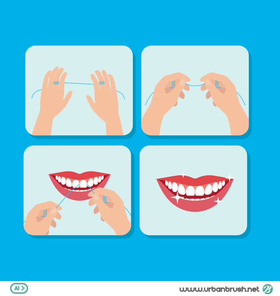 Hi. Urban Brush’s Master Creator Tommy. The image below is a sample dental floss illustration ai file. It is an illustration image depicting step by step how to use floss. The first picture shows the dental floss fixed with fingers. The second picture shows how to hold the floss, the third is the dental floss inserted between the teeth, and the final image is the finished floss. This image is suitable for use in categories such as floss, tooth decay, dentistry, teeth, lips, hands, and cavity prevention. How to use floss Let’s download illustration vector file and use it for the design related to prevention of tooth decay.