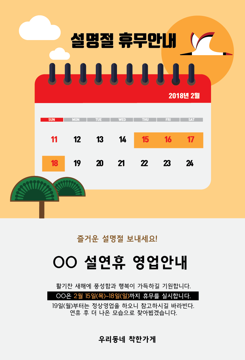 Hi. Urban Brush’s Master Creator Tommy. The image below is a sample of an ai file with a calendar of absence. New Year’s Day, and Chuseok holidays and holidays can be used to illustrate the image of a calendar-type guide. Below is a guide to the 2018 explanation section, but the contents can be freely modified. We can guide the period of the holiday in a calendar form and intuitively guide it, and put the necessary contents at the bottom. It is made in A4 size ratio so that it can be easily used after printing. Download the holiday calendar illustration vector file and make a holiday announcement.