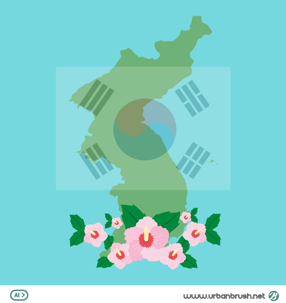 Hi. Urban Brush’s Master Creator Tommy. The image below is a sample ai file on the Korean peninsula. It is an illustration image made using Mugunghwa which is Korea’s representative flower, map of Korean Peninsula, and Taegeukgi. It is an illustrative image composed of a map silhouette, Mugunghwa, and Taegeukgi that can represent Korea’s image well. This image is suitable for use in categories related to Korean Peninsula, Republic of Korea, Korea, New Year’s Day, Memorial Day and Unification. Download the illustration vector file of Korean peninsula and apply it to the design related to Korea.
