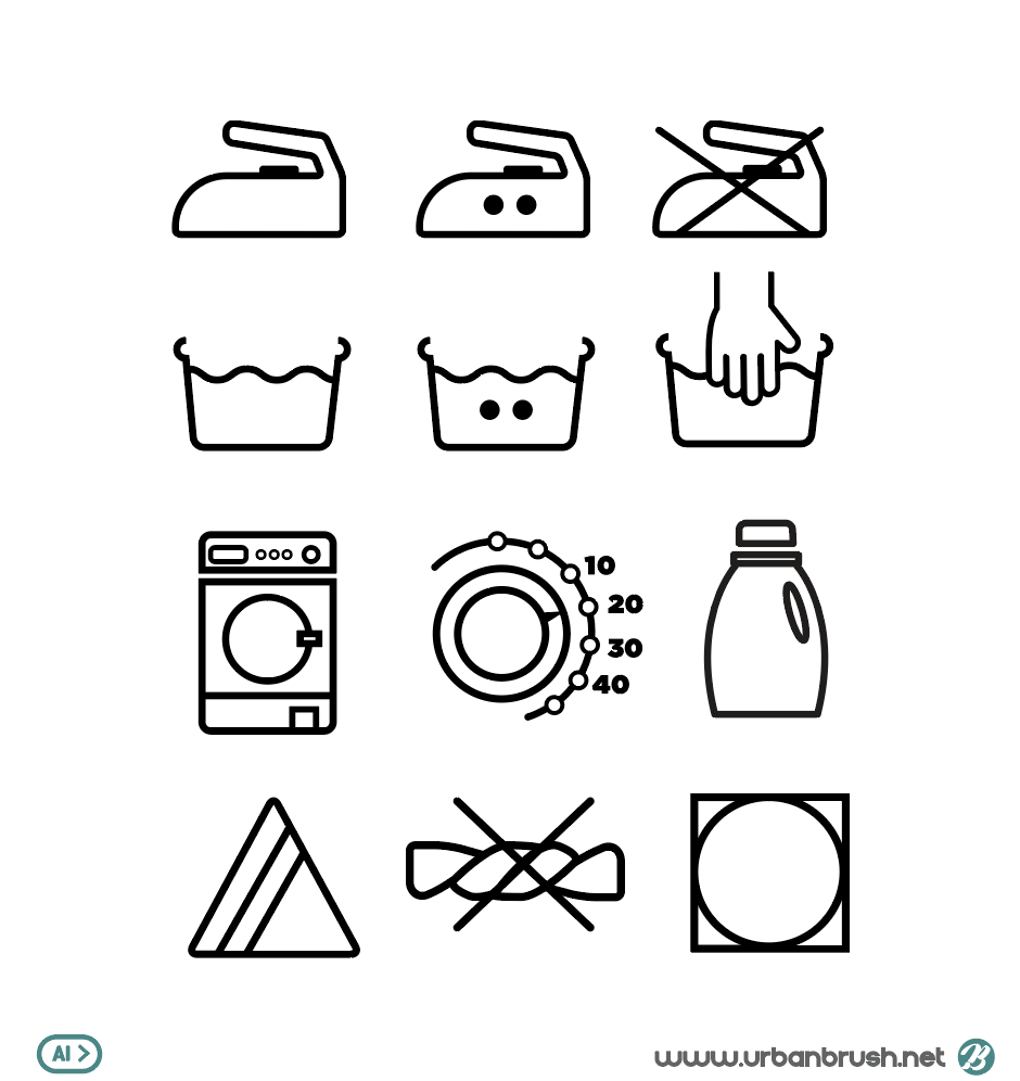 Hi. Urban Brush’s Master Creator Tommy. The image below is a sample of ai file illustrations of laundry. It is an image that is an illustration of a cloth washing guide mark drawn in a washing machine. Includes pictograms for ironing, washing, machine washing, detergent, and drying. It is an illustration image that can be used variously in the theme related to laundry and laundry. Washing, laundry, drying, ironing, and hand-laundering are suitable for use in categories such as illustrations. Download the laundry mark illustration vector file and use it for the image related to the laundry.