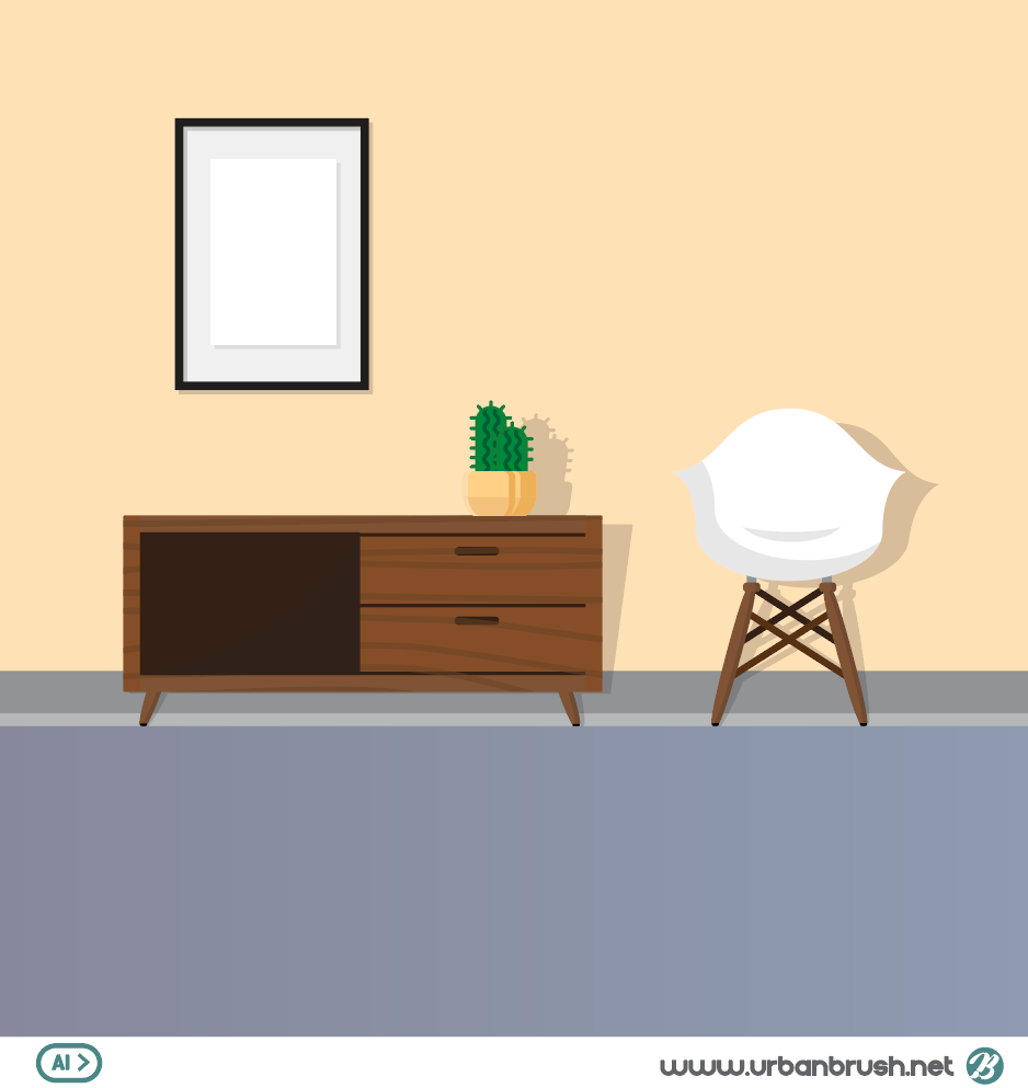 Hi. Urban Brush’s Master Creator Tommy. The image below is a sample of living room ai file. It is an illustration image that represents the most basic furniture in living room interior. It is an illustrative image that depicts the simple living room with tables and chairs, which are usually used as television cabinets, and cacti and frames as accessories. The table has a wooden pattern and a shadow effect. Living room, interior, decorations, chairs, tables, furniture and other categories, such as illustrations are suitable for use in the image. Download the living room illustration vector file and apply it to the design related to the interior.