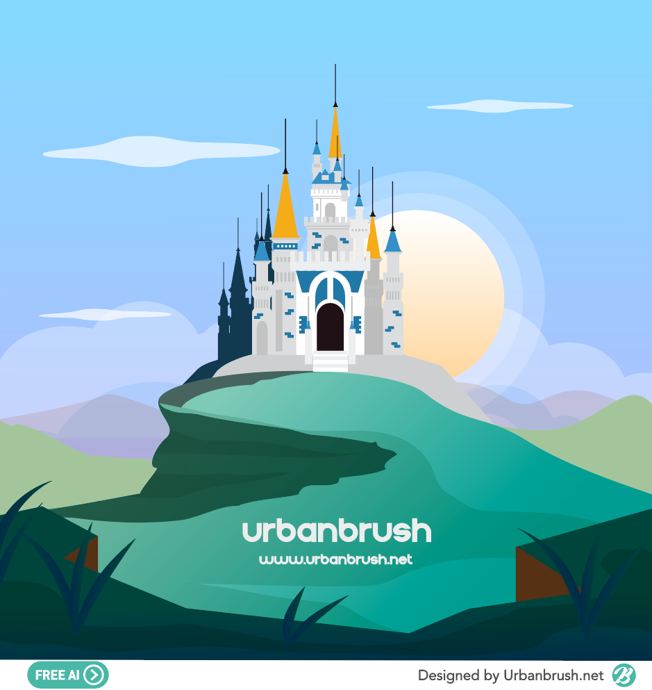 Hi. Urban Brush’s Master Creator Tommy. Below is a sample of a magical castle illustrations ai file. It is an illustration image depicting a castle of magic that can appear in fairy tales. It is based on a castle on a hidden hill where an unknown world, a certain princess, and a prince live. It expresses a beautiful castle on a low garden or a hill. Magical castles, medieval castles, kingdoms, articles, landscapes, hills and other related categories are suitable for illustrations. Download the magic castle illustration vector file and use it for the image related to the fairy tale.