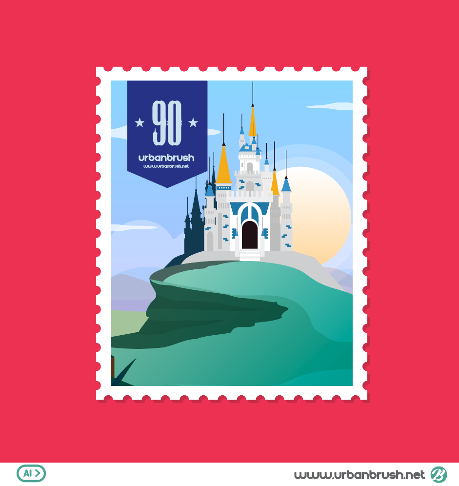 Hi. Urban Brush’s Master Creator Tommy. The image below is a sample of ai file with a magical castle stamp illustration. This is an illustration image of a castle depicted on a hill by a stamp. The stamps show the magical castle, and the castle is depicted magnificently in the garden above the clear sky. Fairy tale, magic castle, princess castle, Disney hill, stamps and other related categories are ideal for illustrations. Download the magic castle stamp vector file and use it for images related to fairy tales.