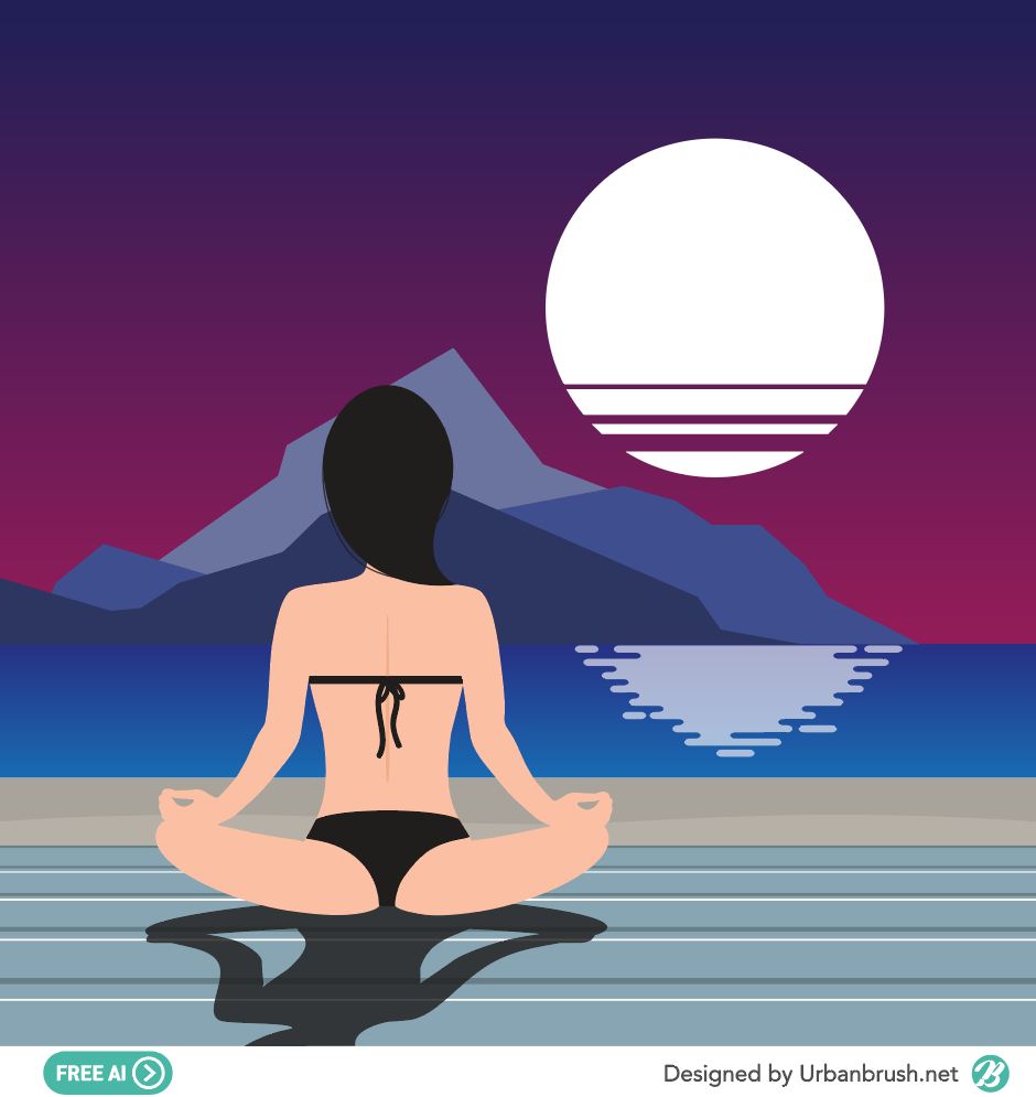 Hi. Urban Brush’s Master Creator Tommy. The image below is a sample meditation illustration ai file. It is an illustration image depicting a woman sitting meditating on a wooden deck on the beach at sunset. The woman is wearing a swimsuit bikini, and the mountains and the sun are depicted beyond the beach. Ideal for use in categories such as meditation, yoga, relaxation, vacation, healing, and danworld. Download the meditation illustration vector file and apply it to the design related to the healing.