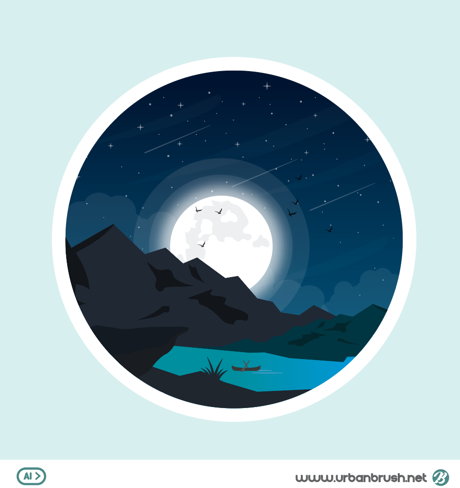 Hi. Urban Brush’s Master Creator Tommy. The image below is a sample of ai file at night lake illustration. It is an illustration image expressing a calm lake in the middle of the night. The moon and stars are shining in the night sky, and there are meteor and night haze. There is a small ship in a lake surrounded by mountains and stones. Night lake, lakeside, starry night, moonlit night, valley and related categories are suitable for use in the illustrations. Download the night lake illustration vector file and use it for the design related to the lake.