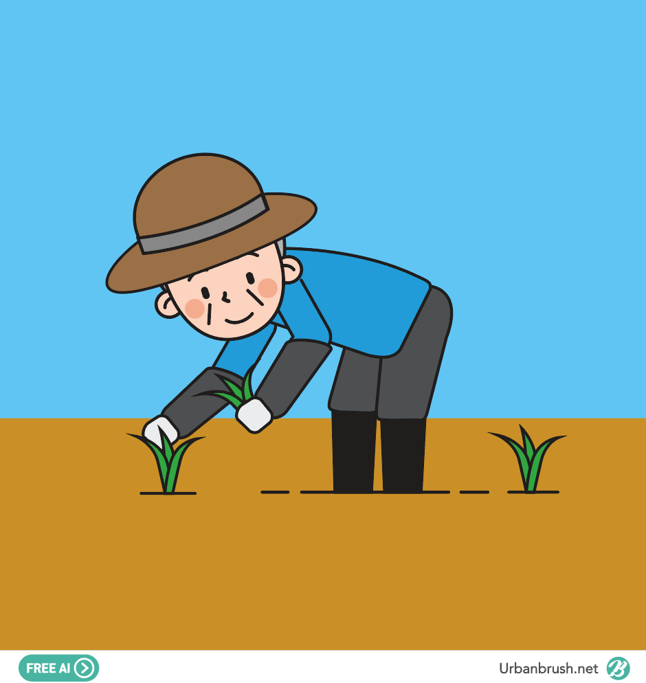 Hi. Urban Brush’s Master Creator Tommy. The image below is a sample of ai file illustration. It is an illustration image depicting a farmer planting seedlings in a rice field. It depicts a farmer wearing a toe and boots with a straw hat commonly used by farmers. It is an illustrative image suitable for use in categories related to farmers, farming, rice planting, rice, and seeding. Download the planting illustration vector file and apply it to the design related to the farming.