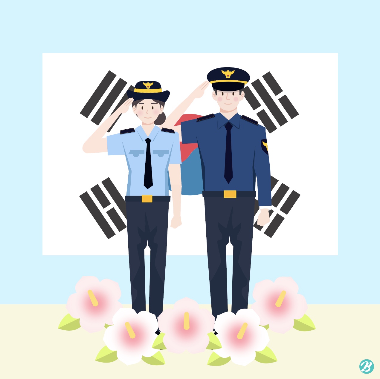 Hi, This is Tommy, Master Creator of Urban Brush. The image below is a sample police day salute illustration. It is an illustration image that expresses a male and female police officer saluting. It is an illustration image depicting the police in front of the Taegeukgi. This image is suitable for use in categories related to Police Day, Police, Investigation, Salute, Taegeukgi, and October. Download the police day salute illustration vector file and use it for design related to police officers. Included fonts are examples and are not included in the file. Please inquire with the font company for use.