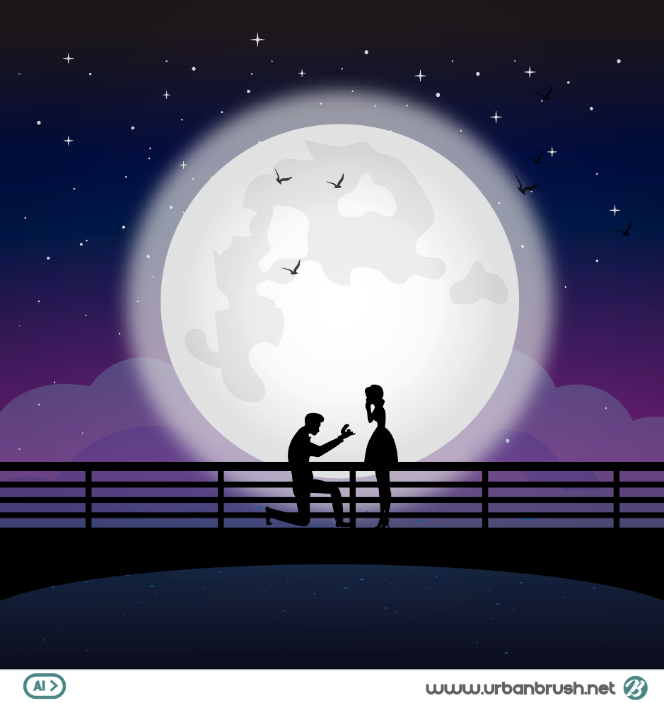 Hi. Urban Brush’s Master Creator Tommy. The image below is a sample of a proposal ai file. It is an illustration image that expresses a scene where a man proposes to a woman on a bridge under the background where the night scenery spreads. A moonlit night, a pair of men and women confess love on the bridge, and the stars are shining in the sky with a bright moon. This image is suitable for use in categories related to confessions, dashes, proposals, night scenes, and night sky. Download the proposal illustration vector file and apply it to the design related to confession.