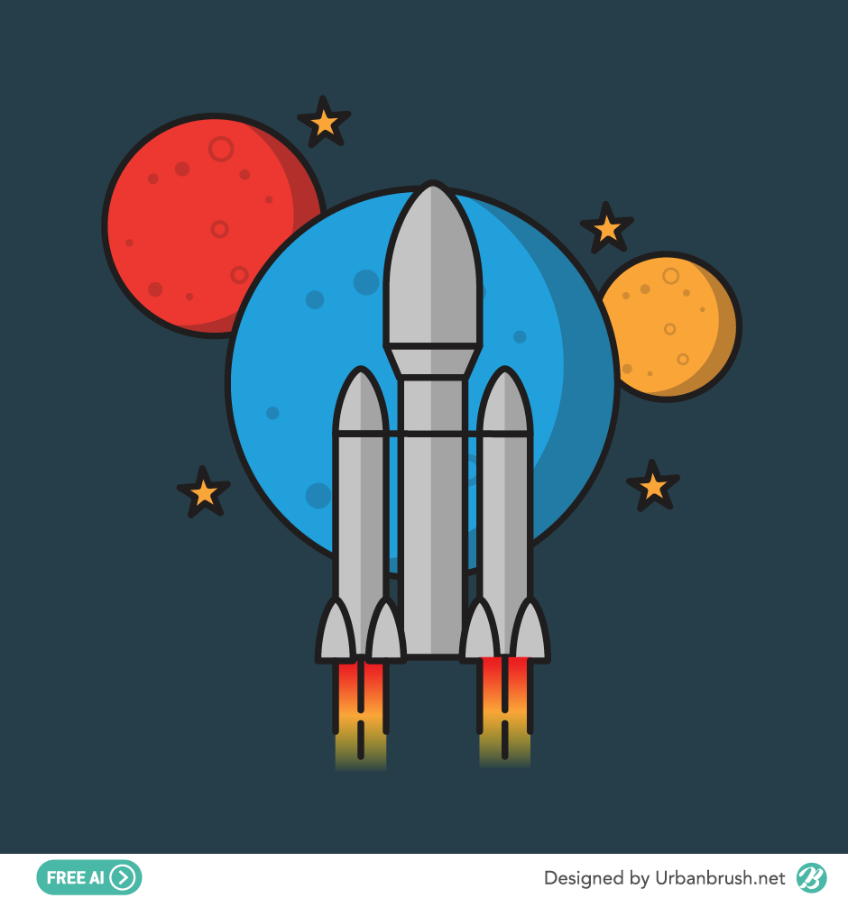 Hi. Urban Brush’s Master Creator Tommy. The image below is a sample rocket ai file. It is an illustration image depicting a rocket flying toward space. There are several planets separated by color, and it is an illustration image expressing the appearance of the rocket flying in flame. Download the rocket illustration vector file and apply it to the design related to the universe.