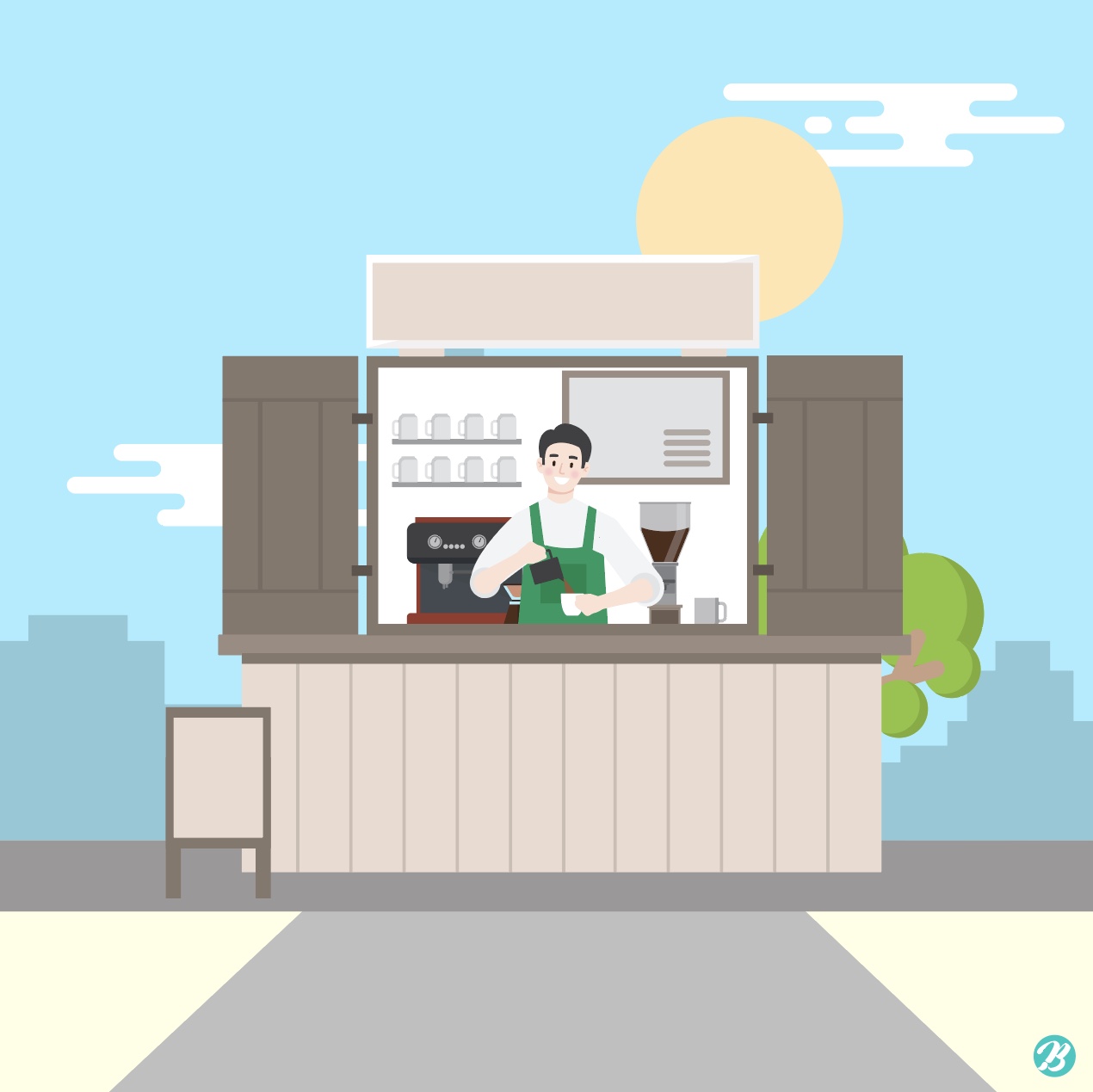 Hi, This is Tommy, Master Creator of Urban Brush. The image below is a sample street cafe illustration. It is an illustration image expressing a cafe on the street. It is an illustration image depicting a barista making curry in a small booth. This is an illustrative image suitable for use in categories related to cafes, streets, baristas, coffee, and beverages. Download the street cafe illustration vector file and use it for design related to the cafe. If you need a graphic design request, please search KakaoTalk “Designer Tommy” and contact us. Included fonts are examples and are not included in the file. Please inquire with the font company for use.
