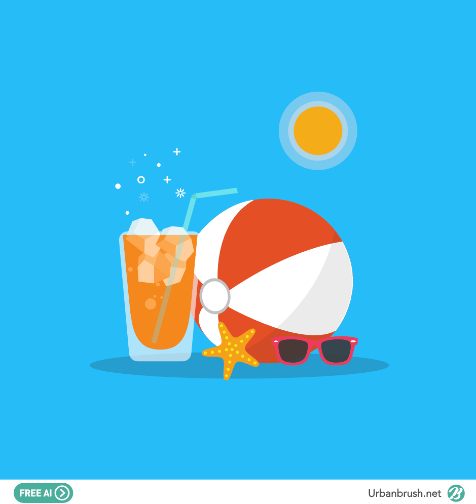 Hi. Urban Brush’s Master Creator Tommy. The image below is a sample summer illustration ai file. It is an illustration image which collects items which can symbolize summer. Includes cool summer drinks and beach balls, sunglasses, starfish and sunshine. Summer, beach, vacation, ocean, recreation and related categories are suitable for use in the illustration image. Download summer illustration vector file and use it for design related to travel.