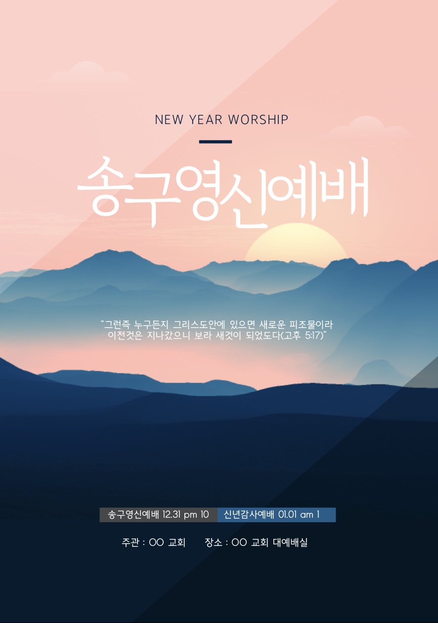 Hi, This is Urban Brush’s Master Creator Tommy. The image below is a sample of a sunrise illustration of a poster design for Song Gu Young Shin Worship. It is a poster illustration image of Song Gu Young Shin worship centered on the situation of sunrise when the sun rises. It is a poster illustration image depicting the contents of Song Gu Young Shin worship. It is an illustrative image suitable for use in categories related to sunrise, sunrise, new year, new year worship, songgu youngshin worship, church, Christianity, and Protestantism. Songgu Youngshin Worship Poster Design Download the sunrise illustration vector file and use it for design related to the worship poster. The fonts included are examples and are not included in the file. Please contact the font company for usage.
