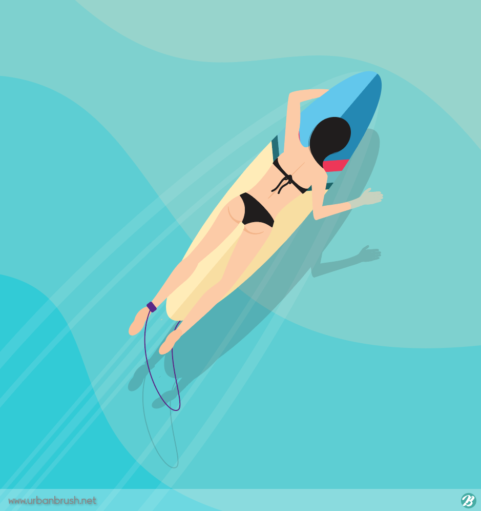 Hi. Urban Brush’s Master Creator Tommy. The image below is a sample surf ai file. An illustration image that depicts a scene where a female surfer is swimming on the surfboard while swimming in the sea. Surfboard on the sea is an illustration image depicting a female surfer who is riding on the water and riding forward. Surfing, sea, leisure, sports and other categories related to the image is suitable for illustration. Download the surfing vector file and apply it to the design related to summer sports.