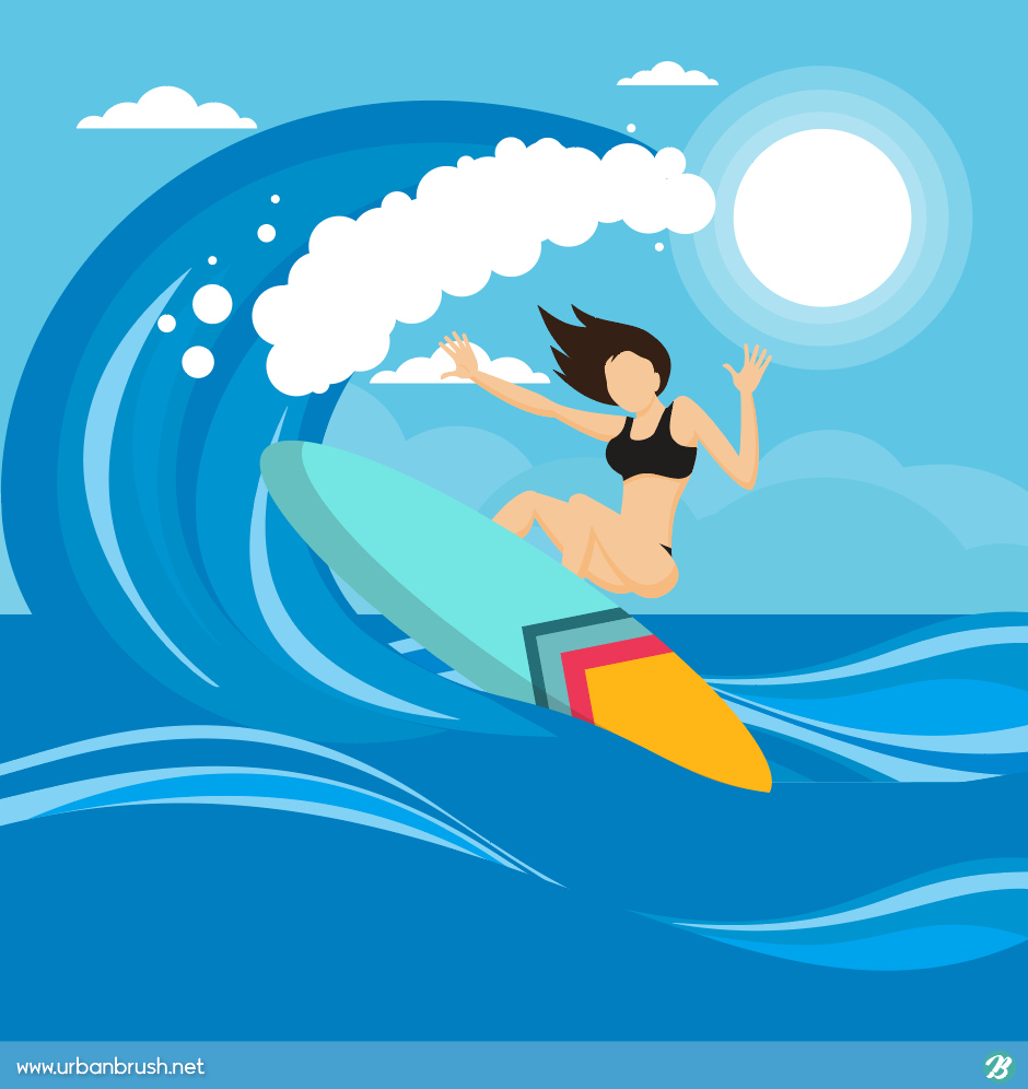 Hi. Urban Brush’s Master Creator Tommy. The image below is a sample surf ai file. It is an illustration image depicting a scene where a woman is surfing on a surfboard on a surfboard. It is an illustration image expressing a surfer who enjoys surfing at the beach wearing a bikini swimwear and surfing waves. Summer, beach, sea, waves, surfing, vacation, vacation, vacation, sports, leisure and is suitable for use in categories such as illustrations. Download the surfing vector file and use it for design related to summer leisure sports.