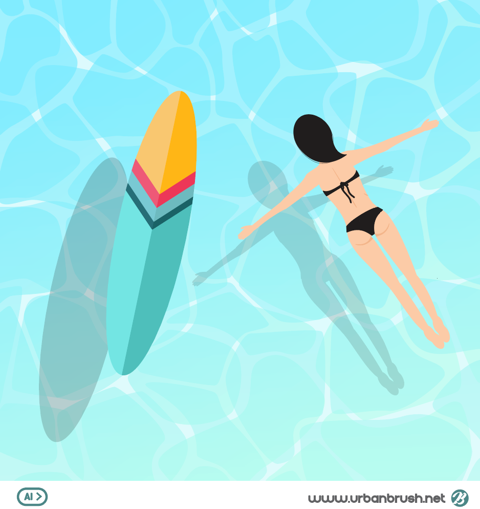 Hi. Urban Brush’s Master Creator Tommy. The image below is a sample swim illustration ai file. It is an illustration image expressing a woman swimming in a pool. It is an illustration image expressing the landscape of a free and relaxing feeling together expressing a woman wearing a surfboard and a bikini on the sea or a swimming pool water. Surfing, the sea, swimming pool, bikini, swimming, recreation, holiday and other related categories are suitable for illustrative images. Download the swim illustration vector file and use it for your travel related design.