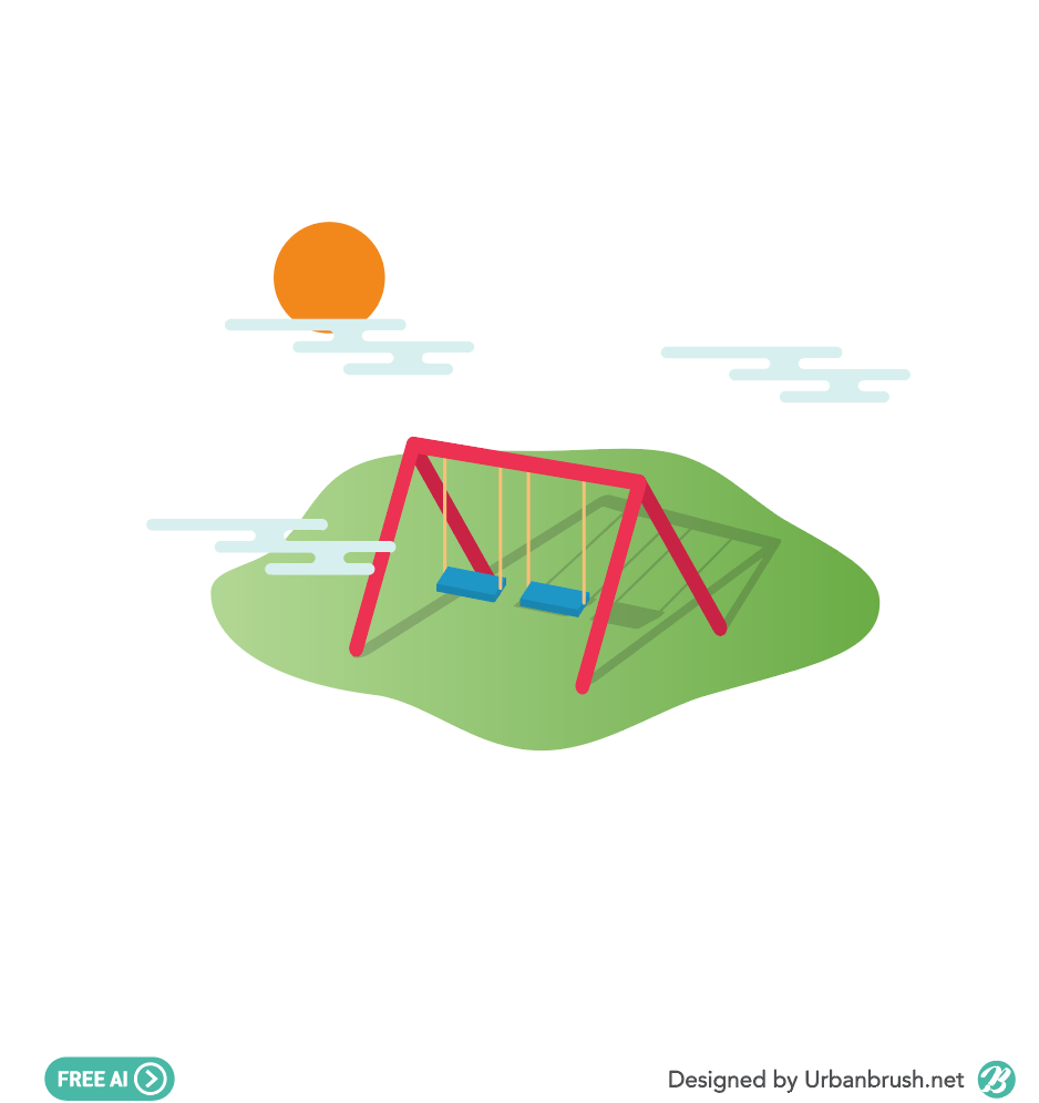 Hi. Urban Brush’s Master Creator Tommy. The image below is a swatch illustration ai file sample. It is an illustration image depicting a swing for two people that can be easily seen in children’s playground. It is a three-dimensional illustrative image composed of a swing on a green lawn, a shadow, a cloud, and a sun together. Playground, children, swing is an image that is suitable for use in categories related to swing. Download the swing illustration vector file and apply it to the design related to children.