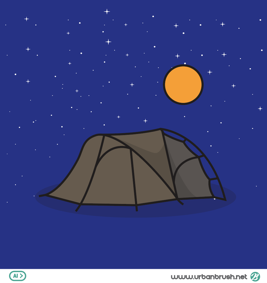 Hi. Urban Brush’s Master Creator Tommy. The image below is a sample tent illustration ai file. Illustration image depicting a tent under a starry night sky. It depicts a scene of camping, the moon and stars are shining, and camping tents are represented. Tent, camping, camping, travel and other categories are suitable for use in illustration images. Download the tent illustration vector file and use it for design related to camping.