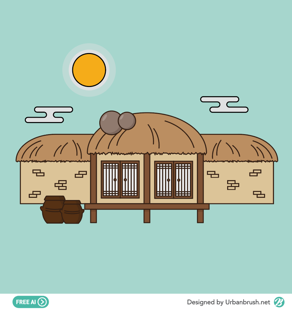 Hi. Urban Brush’s Master Creator Tommy. The image below is a sample of ai file illustrations of thatch. It is an illustration image depicting a straw and ocher, a tree-built thatched house. The roof of that house is covered with a chestnut, and it includes thatch house, thatched wall, and a jar. There are clouds and sky in the sky. It is an illustrative image suitable for use in categories related to thatch house, folk village, and traditional house. Download the herbivorous illustrations vector file and use it for design related to the folk village.