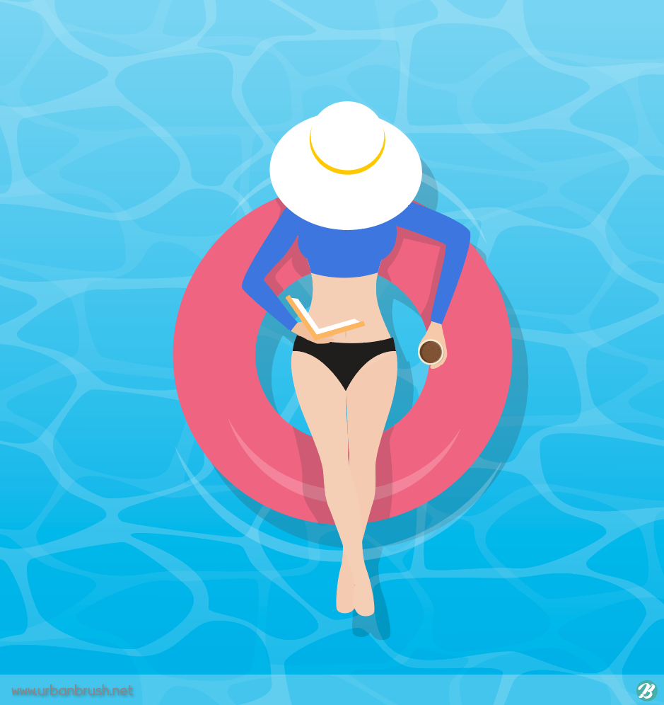 Hi. Urban Brush’s Master Creator Tommy. The image below is a sample of ai file with tube illustration. An illustration image of a woman sitting in a tube and enjoying a swim. An illustration image of a woman wearing a long brimmed hat and wearing a lash guards enjoying a dip in a swimming pool sitting on a tube. To express the feeling of relaxation, a woman sitting on a tube expressed coffee with one hand and a book with the other. Ideal for use in categories such as swimming pools, water sports, vacations, recreation, leisure, vacations, and summer vacations. Download tube illustration vector file and use it for design related to water play.
