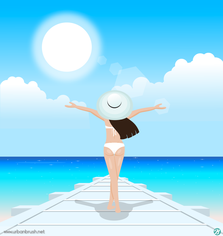 Hi. Urban Brush’s Master Creator Tommy. Below is a sample illustration of ai file with a woman on the beach. It is an illustration image depicting a woman walking on a wooden deck with two arms on the sea port. It is an illustration image depicting a woman wearing a hat on a wooden deck stretched over the blue sea and walking in a bikini with both hands open. A lot of blue, sea, cumulus clouds and sunshine are reflected in the sky. It is an illustrative image suitable for vacation, summer vacation, leisure, relaxation, recreation, vacation, vacation, sea and other categories. Download the illustration vector file of a woman on the beach and use it for the design related to vacation.